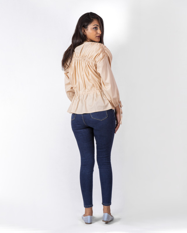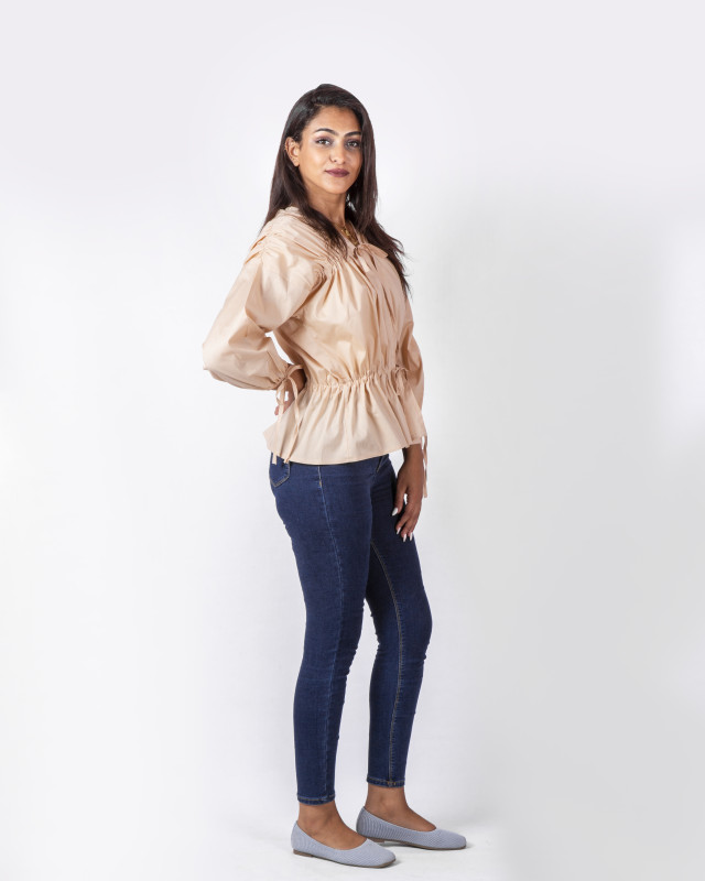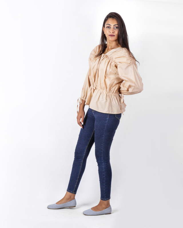 بلوزة قماش ببلين كم طويلوان سايزلون بيج